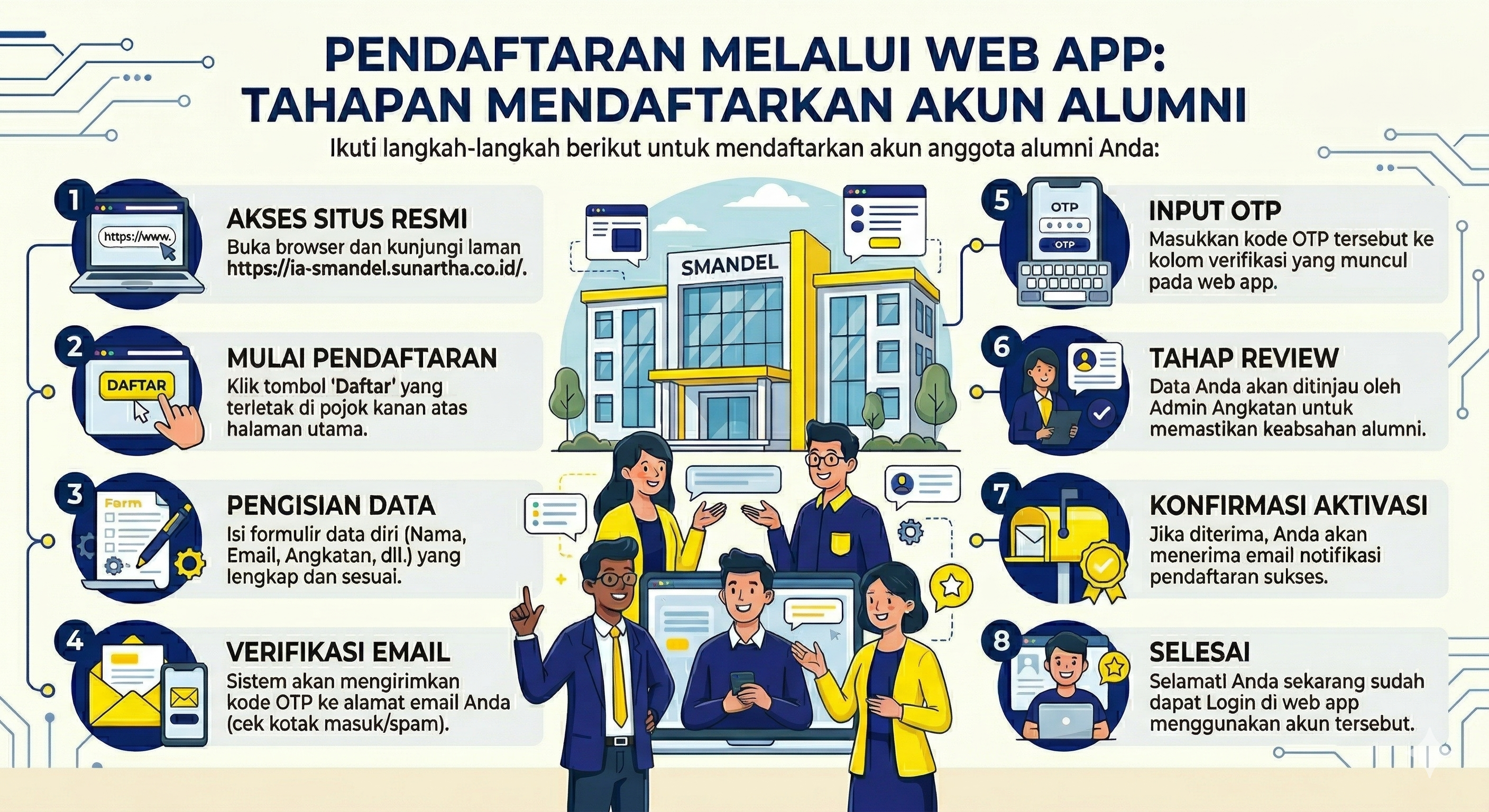 Proses pendaftaran anggota dilakukan melalui situs resmi dengan melengkapi data diri dan verifikasi OTP email untuk divalidasi oleh admin angkatan sebelum akun dinyatakan aktif.